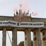 Oben angelangt entrollten sie ein Banner, auf dem sie Israel Völkermord vorwarfen