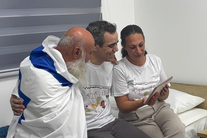 Ein Foto zeigt den 48-Jährigen nach seiner Freilassung in einem weißen T-Shirt neben seiner Frau und seinem Vater Dani auf einem Bett sitzen. Auf dem Shirt ist ein Kinderbild zu sehen. Daneben steht: »Aba, Ima, Roni, Alma.«