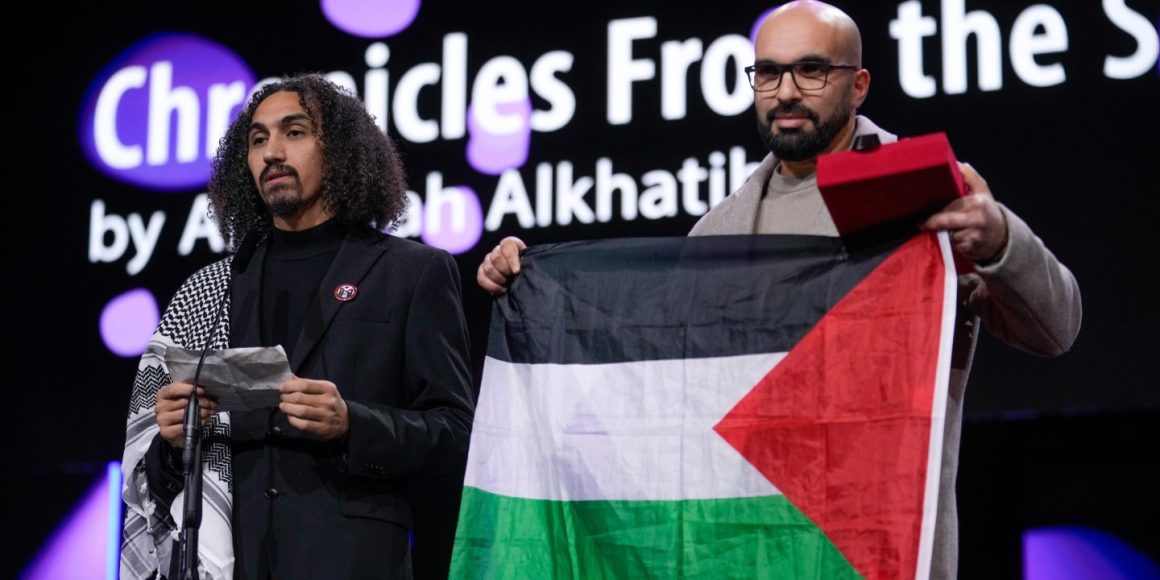 Alkhatib, der eine palästinensische Flagge von einem Begleiter mit auf die Bühne brachte, die umgedreht gehalten wurde, sagte, eines Tages werde es ein wunderbares Filmfestival in Gaza geben. »Wir werden uns an jeden erinnern, der an unserer Seite stand, und wir werden uns an jeden erinnern, der gegen uns war.« Im Saal waren Applaus und auch Zwischenrufe zu hören.
