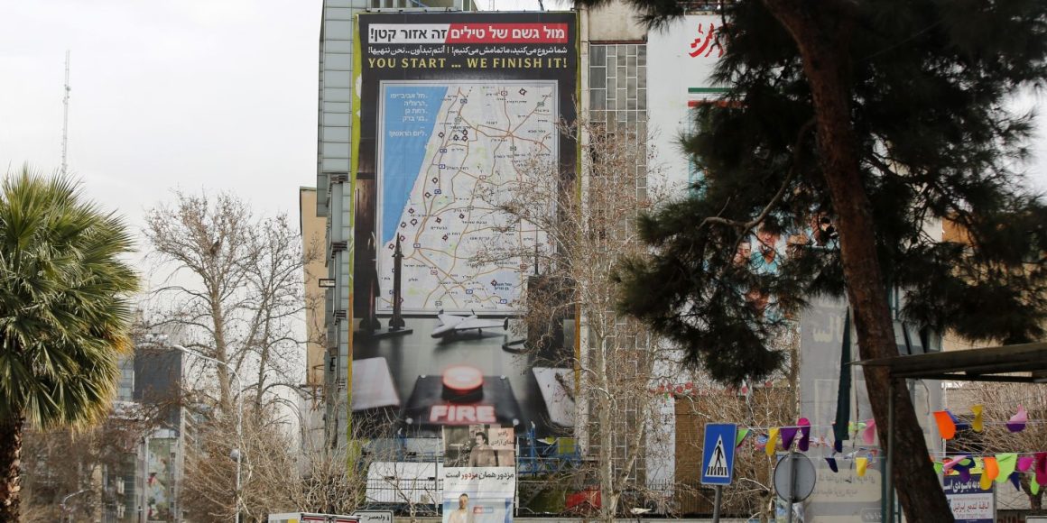 Eine überdimensionale Karte, die Tel Aviv, Herzliya, Ramat Gan und Bnei Brak zeigt – aufgestellt im Zentrum von Teheran. Darüber steht in fetten Lettern »Im Hinblick auf einen Raketenhagel ist dies ein kleines Gebiet« auf Hebräisch und darunter auf Englisch: »Ihr fangt an… wir beenden es!« Unter der Karte sind Raketenmodelle, ein Flugzeug, ein Walkie-Talkie und ein roter Knopf mit dem Wort »FIRE« abgebildet. Drohgebärde auf iranisch.