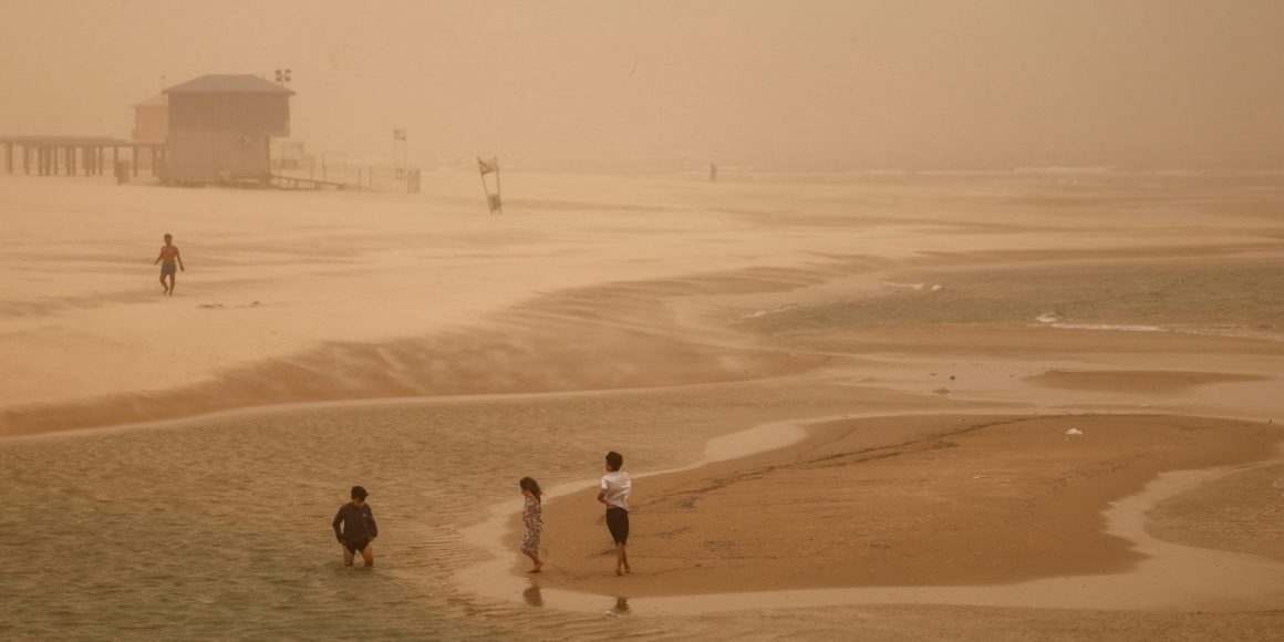 Ein Sharav, ein heftiger Sandsturm, zieht derzeit über Israel und den Gazastreifen. Auf Bildern waren Wolken aus orangefarben gefärbtem und dichtem Staub zu sehen. Weite Teile Israels — vor allem der Süden und das Zentrum des Landes — sind von dem Sandsturm mit starken Windböen betroffen. Nach Angaben der Behörden beschädigte der Wind in einigen Gebieten im Süden die Strominfrastruktur und Stromleitungen wurden abgerissen, was zu Stromausfällen in mehreren Ortschaften im Negev führte.