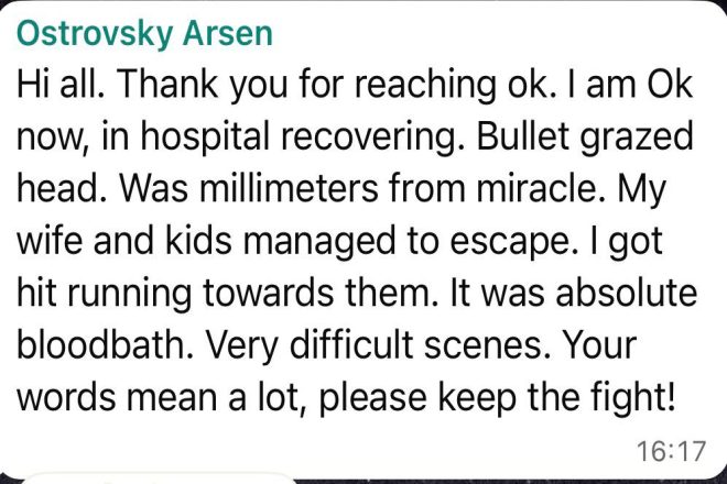 Die Kugel habe seinen Kopf gestreift, so Ostrovsky. »Ich habe stark geblutet. Die Ärzte sagten, es sei ein Wunder, dass ich überlebt habe, so knapp war es. Ich wurde jetzt genäht. Das Schlimmste war, in diesem Moment von meiner Frau und meinen Kindern getrennt zu sein. Ich wurde getroffen, als ich auf sie zuging. Zum Glück sind sie unverletzt geblieben. Es war ein absolutes Blutbad, überall Kinder und ältere Menschen.«