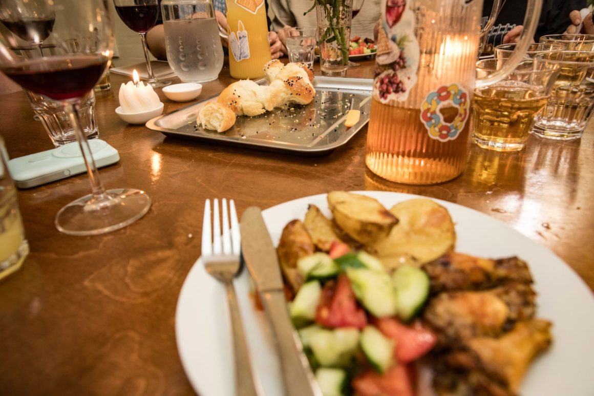 Der Tisch steht im hinteren Raum, gleich neben der Küche, in der Maria mit den letzten Vorbereitungen beschäftigt ist. Seit zwei Jahren kocht sie für das Schabbat-Dinner und ist stolz darauf, noch nie ein Gericht wiederholt zu haben. Sie ist Armenierin, selbst nicht jüdisch. Sie schaue sich ständig Rezepte auf TikTok an, auf der Suche nach Inspiration, sagt sie. Der Granatapfelwein sei koscher zertifiziert, sagt Nathaniel, Marias Freund und einer der beiden Gastgeber des Essens am Freitagabend. Vor vier Jahren kam er aus Moskau nach Jerewan, im März 2022, als einer der Emigranten, die Putins Krieg nicht mittragen wollten.