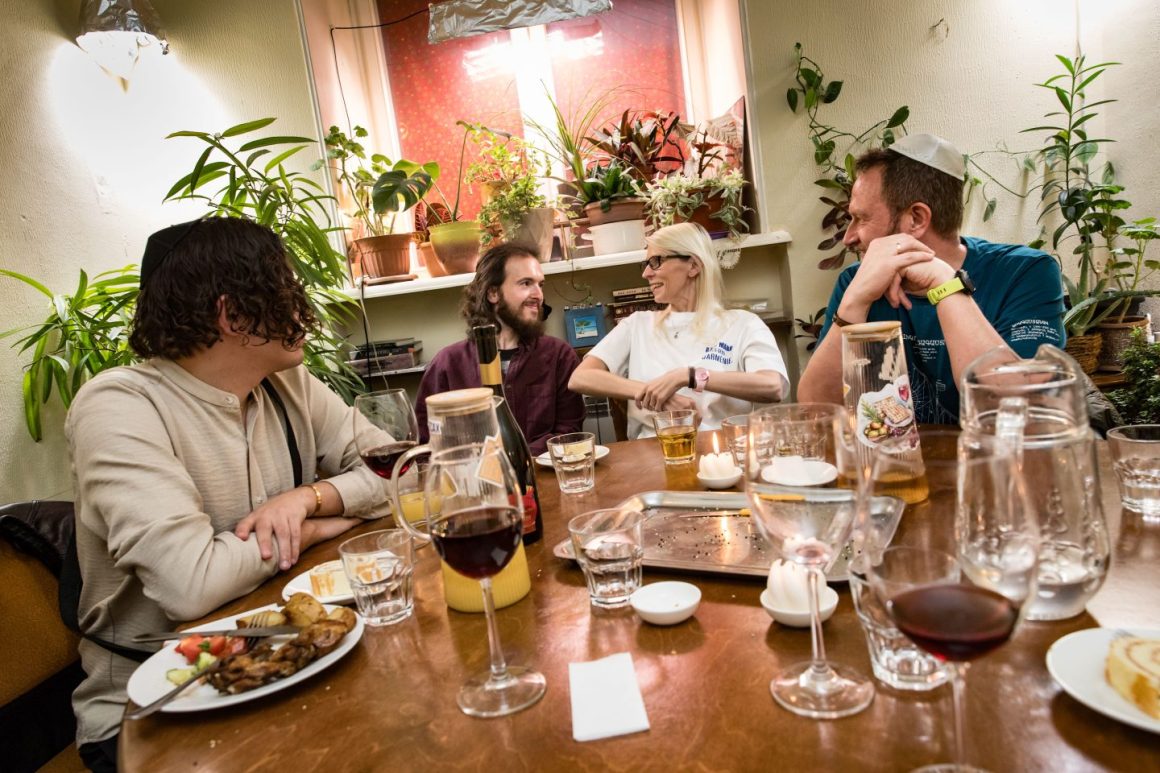 Das Schabbat-Dinner endet mit einer Biskuitrolle, die Maria gebacken hat. Die Gäste am Tisch reden in ihren vielen Sprachen durcheinander. Nathaniel erzählt, dass ihre Chatgruppe inzwischen 600 Mitglieder habe – aus Russland, der Ukraine, aus Belarus, den USA und Kanada, dem Iran, und seit dem 7. Oktober 2023 seien auch russischsprachige Israelis hinzugekommen.