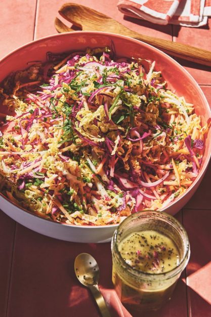 Für das Dressing alle Zutaten in ein Schraubdeckelglas geben und kräftig durchschütteln – wie einen Cocktail. Mit Salz und frisch gemahlenem schwarzen Pfeffer abschmecken und im Schraubdeckelglas beiseitestellen, damit sich die Aromen entfalten und der Mohn etwas aufquillt. Rotkohl, Chinakohl, Zwiebel und Äpfel in einer großen Schüssel vermengen.