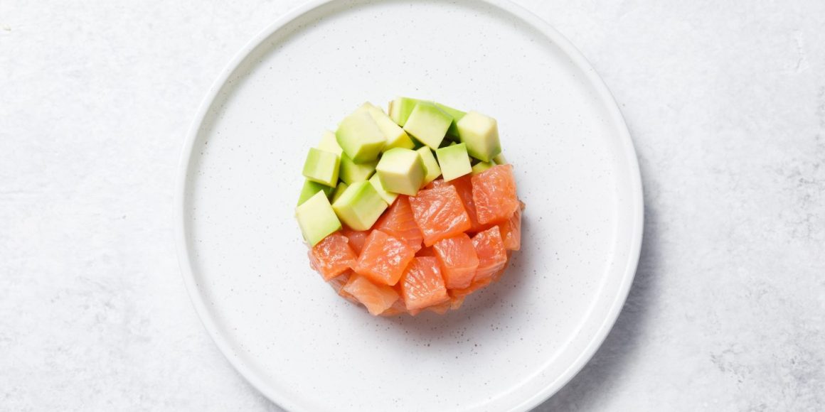 Den Lachs und die Avocado in einen Zentimeter große Würfel und die Zwiebel in kleine Würfel schneiden. Petersilie, Dill und Knoblauch fein hacken. Alle Zutaten für das Tatar in einer Schüssel zusammenrühren. Das Dressing separat mischen. Dafür werden die Zutaten erwärmt und in einem Mixer püriert. Durch ein Tuch passieren und abkühlen lassen. Anschließend beides verrühren. Als Garnitur Kartoffelstroh und Kresse servieren.