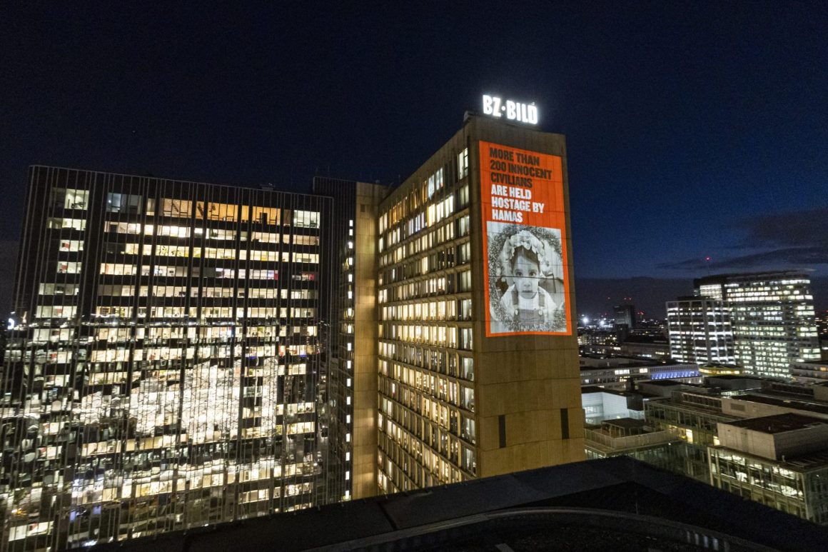 Mit einer rund 200 Quadratmeter großen Videoinstallation hat der Axel-Springer-Konzern am Dienstag auf das Schicksal der von der Hamas in den Gazastreifen entführten Geiseln aufmerksam gemacht. Fotos der mehr als 200 Verschleppten wurden am Abend an die Fassade des Springer-Hochhauses in Berlin projiziert.