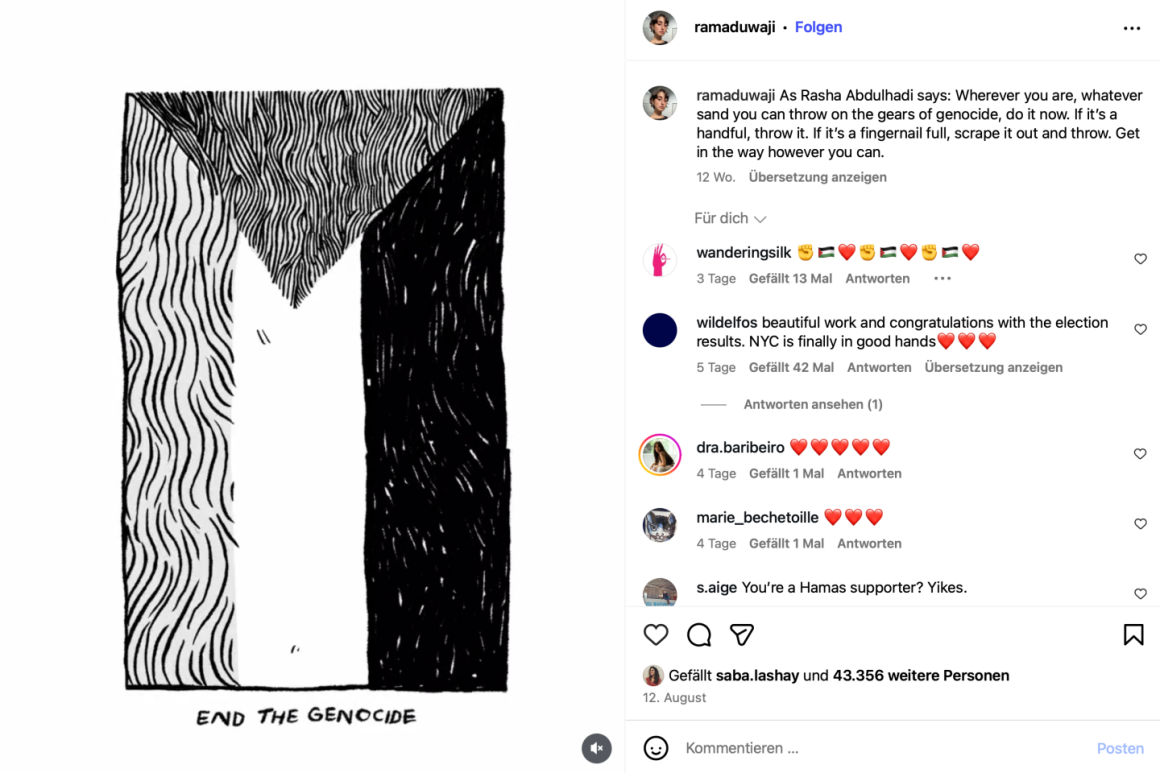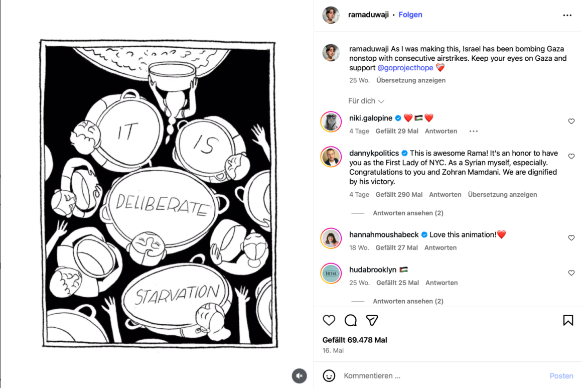 Rama Duwaji ist die Ehefrau von Zohran Mamdani, der gerade zum New Yorker Bürgermeister gewählt worden ist. Ähnlich wie er behandelt sie Palästina als zentrales und identitätsstiftendes Thema in ihrem Leben und Schaffen, wiewohl sie sich zu anderen Angelegenheiten in der Öffentlichkeit zurückhält.