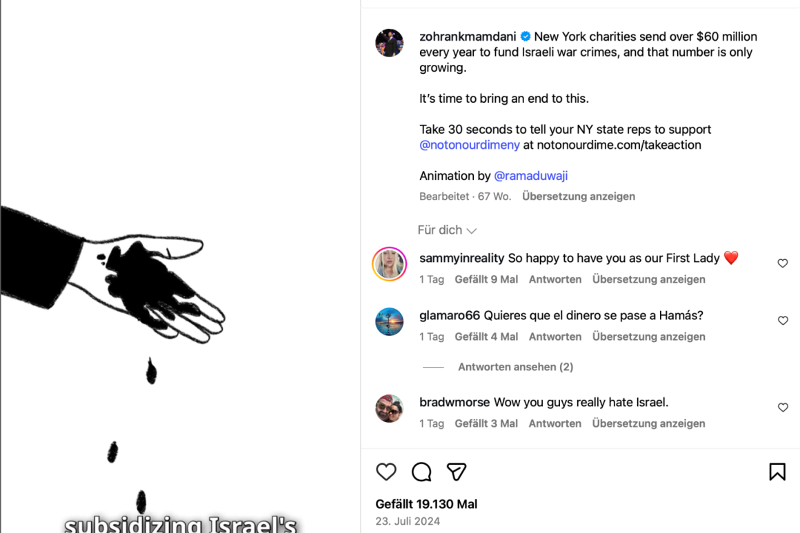 Dieses vage Projekt namens »Not on our dime« würde viele Organisationen, die sich unter anderem für Terroropfer einsetzen, unter Generalverdacht stellen. Mamdanis Frau kreierte den Werbefilm dazu: mit israelischen Drohnen und Blut, das aus Händen tropft, um angebliche israelische Kriegsverbrechen zu illustrieren. Auch hat Mamdani im Jahr 2023 vor laufenden Kameras moniert, der Stiefel der New Yorker Polizei sei »von der IDF geschnürt worden«.