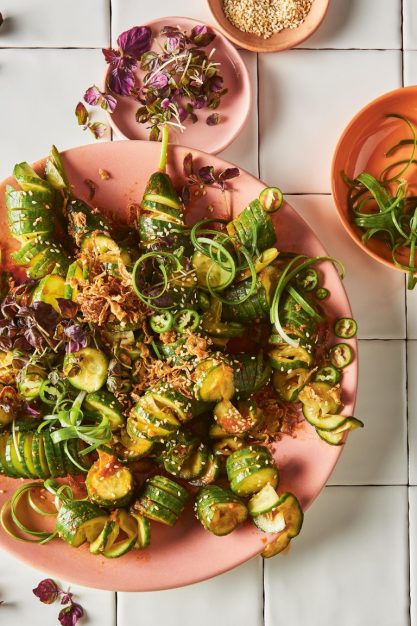 Für das Dressing alle Zutaten in einer großen Schüssel verquirlen. Die Gurkenspiralen hineinlegen und vorsichtig im Dressing wenden. Mit Frühlingszwiebeln, Chiliringen, Shiso, Sesam und frittierten Schalotten bestreut servieren.