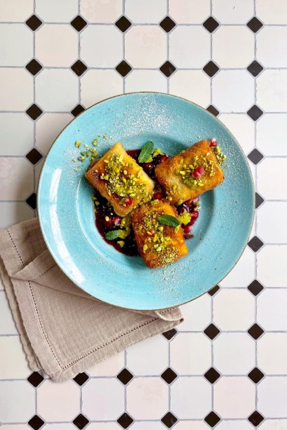 Die Pistazien zerstoßen. Die frittierten Mhalabi-Stücke heiß mit zerstoßenen Pistazien, Granatapfelkernen, Minze und Sirup servieren.