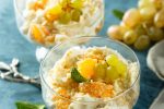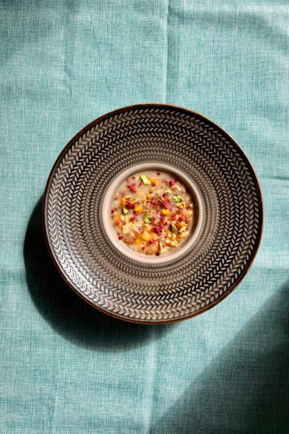 In Schalen servieren und ganz nach Geschmack mit Granatapfelkernen, Nüssen und getrockneten Himbeeren garnieren.