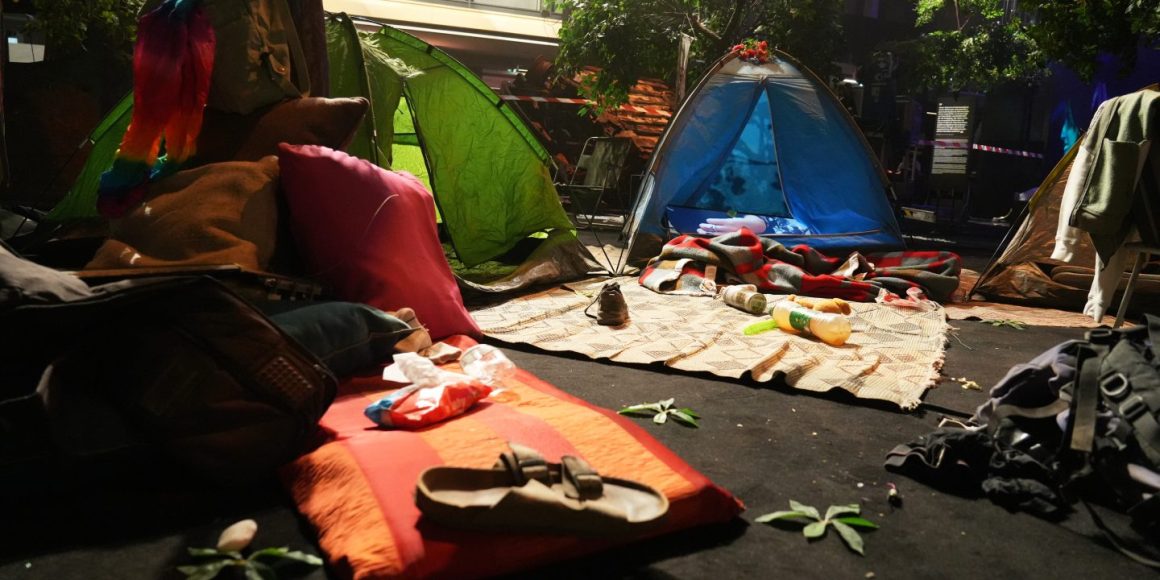Die Ausstellung im ehemaligen Flughafen Tempelhof ist in drei Teile geteilt, wie Initiatorin und Kuratorin Reut Feingold erklärt. Nachdem man in der Eingangshalle ein Video über die Nova-Gemeinschaft gesehen hat, befindet man sich auf dem nachgebauten Campingplatz mit Zelten, Campingstühlen, ausgebrannten Autos, Toiletten. Alle Exponate seien echte Stücke vom Festivalgelände, erzählt die Kuratorin. Die Besucher seien eingeladen, an allem zu riechen und die Exponate anzufassen oder etwa die Handys, auf denen Videos abgespielt werden, in die Hand zu nehmen.