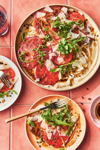 Die Tomaten mit einem scharfen Messer quer in maximal 5 mm dicke Scheiben schneiden. Die Thunfischcreme auf einem großen Servierteller verstreichen. Die Tomatenscheiben dekorativ darauf verteilen, wie bei Vitello tonnato oder Carpaccio. Den Rucola darüberstreuen.