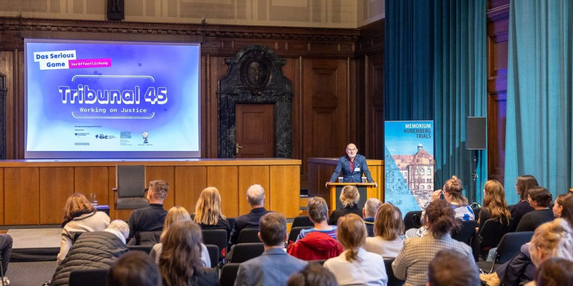 Aber darf das ein Computerspiel zu so einem ernsten Thema, auch wenn es ganz klar in das Genre der »Serious Games« gehört? Darüber debattierten jetzt im Saal 600 Vertreterinnen der Stiftung EVZ und des Memoriums Nürnberger Prozesse, das seit 2010 die Ereignisse am historischen Ort mit einer Ausstellung dokumentiert, mit Spieleexperten und den Machern von »Tribunal 45«.