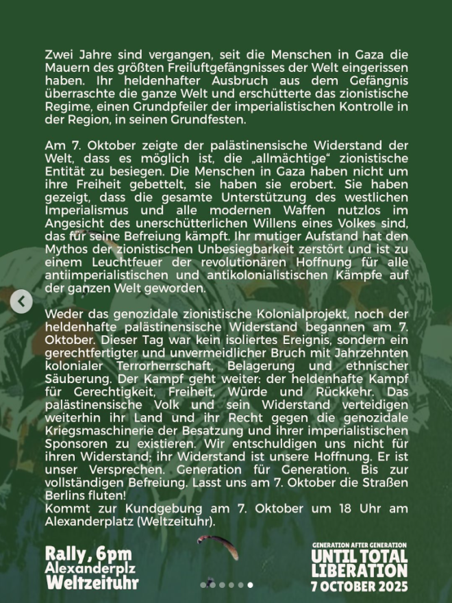 Die Massaker vom 7. Oktober werden in der Ankündigung als »heldenhafter Ausbruch« aus einem »Gefängnis« beschrieben, der gezeigt hätte, »dass es möglich ist, die ›allmächtige‹ zionistische Entität zu besiegen«. Der Terror der Hamas wird als »Leuchtfeuer der revolutionären Hoffnung für alle antiimperialistischen und antikolonialistischen Kämpfe« gedeutet. »Wir entschuldigen uns nicht für ihren Widerstand.« Zum Schluss der Aufruf: »Bis zur vollständigen Befreiung. Lasst uns am 7. Oktober die Straßen Berlins fluten!« Geziert wird der Beitrag mit Bildern von Paraglidern derselben Art, die die Hamas für ihren Angriff genutzt hat.