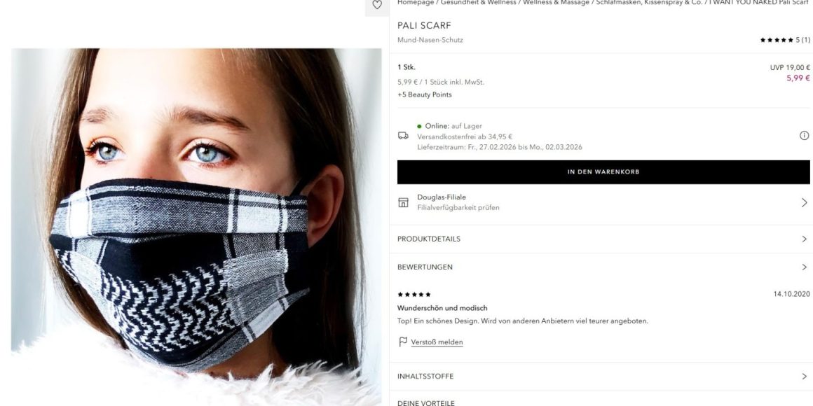 Man habe von der Maske drei verschiedene Versionen produziert, eines davon sei das Kufiya-Muster gewesen. »Warum Douglas diesen Artikel nach wie vor im Online-Shop anbietet, ist mir selbst auch ein Rätsel. Es gibt das Produkt seit 2022 nicht mehr«, so Werr.