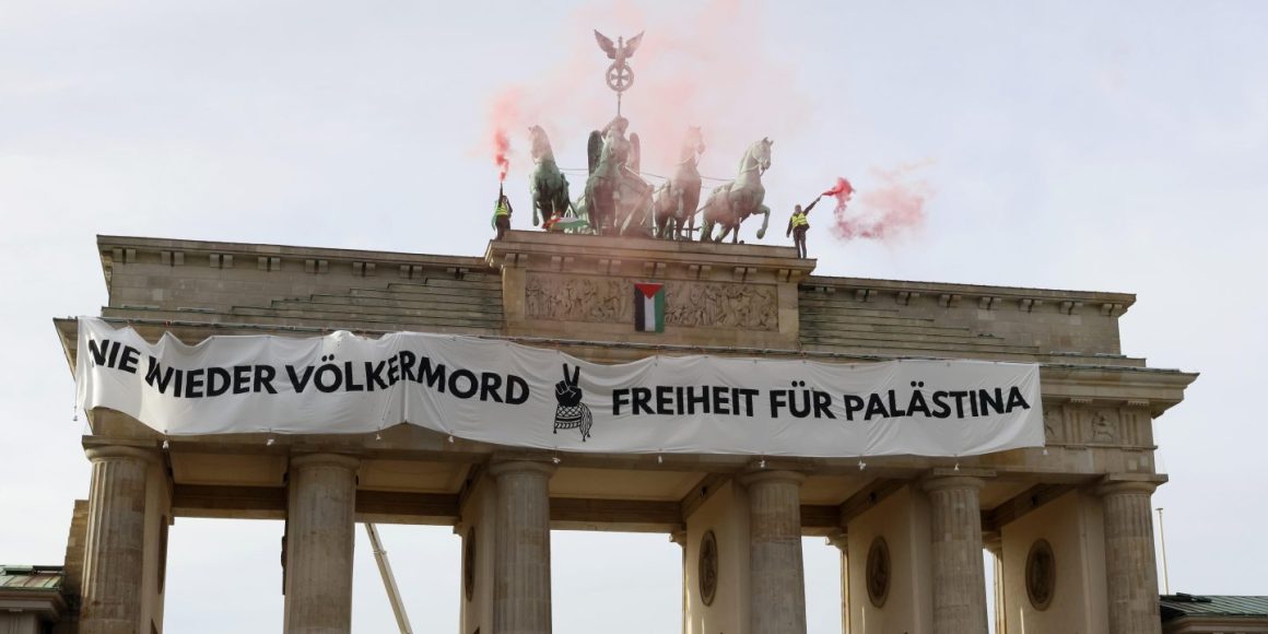 Mehrere Demonstranten sind auf das Brandenburger Tor in Berlin geklettert und haben ein israelfeindliches Transparent aufgehängt. Die Polizei sprach von drei Aktivisten, die mit einer Hebebühne auf das Tor gelangt seien. Auf dem Banner war zu lesen »Nie wieder Völkermord – Freiheit für Palästina«.