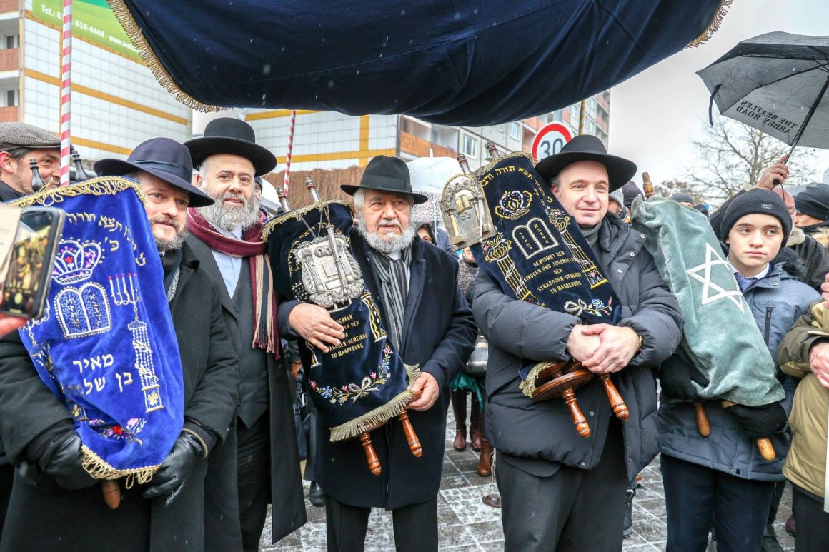 Es sind 321 Schritte vom Mahnmal für die am 9. November 1938 zerstörte Magdeburger Synagoge bis zum Neubau. Am vergangenen Sonntag wurde die neue Synagoge in der Landeshauptstadt von Sachsen-Anhalt eingeweiht. Zwei Tage zuvor schreitet ein Festzug die Strecke ab. Die drei vorhandenen Teile der Torarolle der Magdeburger Synagogen-Gemeinde werden von Rabbinern zum neuen Schrein getragen. Langsam gehen sie – geschützt unter einem von vier Trägern gehaltenen Baldachindach aus dunkelblauem Samt, umsäumt mit goldener Quastenborte – die Julius-Bremer-Straße im Herzen Magdeburgs entlang.