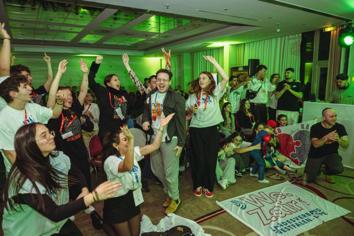 Nach dem Abendessen ist es endlich so weit, und die Türen des großen Kongresssaals gehen auf. Sogleich herrscht dort Party-Stimmung: Die Teams schwenken ihre eigens angefertigten Fahnen und proben lautstark ihre Fan-Gesänge, einige tanzen zu den vom DJ eingespielten israelischen Party-Hits. Punkt 20 Uhr eröffnet Moderator Jurij Belenkiy die Show: »Herzlich willkommen bei JQ 2024 – es wird ein legendärer Abend«, verspricht der Webvideoproduzent, dessen TikTok-Account »Kapuzenjuri« eine Million Follower erreicht.