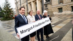 Ein paar Stunden zuvor hat Hilbert die interaktive Kunstinstallation »Verschwindende Wand« am Rathaus eröffnet, ein Projekt des Goethe-Instituts: 6000 Holzklötzchen mit Zitaten von Schoa-Überlebenden. Die Besucher sind eingeladen, die Klötzchen herauszuziehen, die Zitate zu lesen und mitzunehmen, damit die Botschaften der Überlebenden weitergetragen werden.