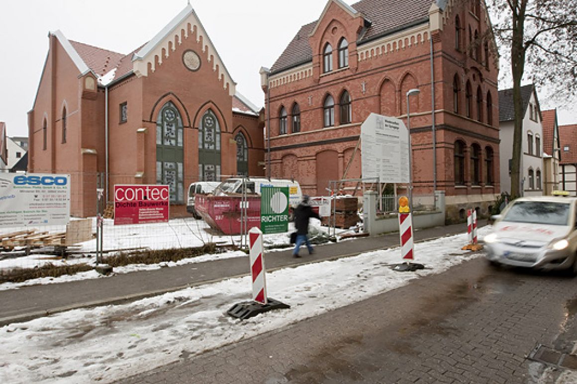 Dahlmeier, Gemeindevorsitzender Rothe und der Gemeinde-Projektkoordinator Ruben Heinemann sind oft auf der Baustelle, jetzt kurz vor dem Abschluss der Arbeiten, wie auch in den vergangenen 21 Monaten. Über drei Etagen erstreckt sich der Neubau, überall sind noch Handwerker und Techniker im Einsatz: Maler streichen Wände, Elektriker verkabeln Steckdosen, Heizungsbauer justieren die Steuerung für die Fußbodenheizung und Metallbauer montieren das Treppengeländer.