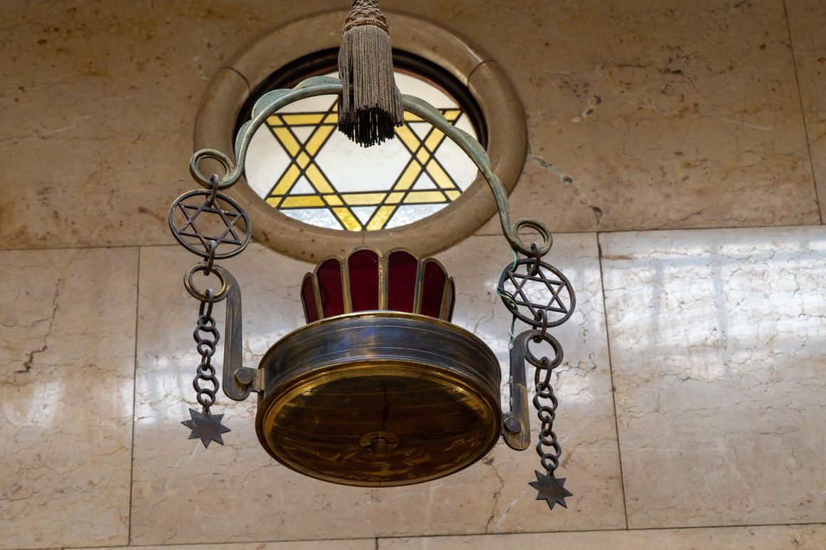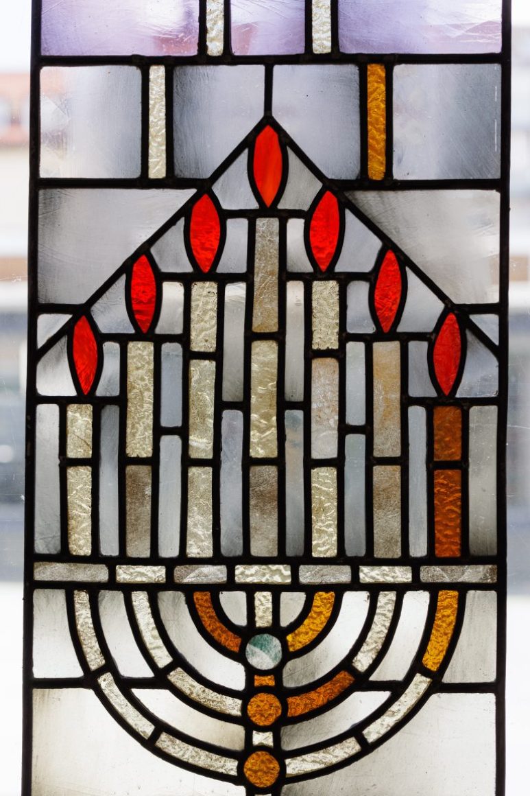 Die Farben der Synagoge überwältigen. Das Foyer ist in einem kräftigen pompejischen Rot gestrichen und wird von einem schwarzgrundigen Marmorsockel umfasst. Der große Betraum besticht durch seine sublime Lichtkonzeption und das Spiel der Farben. Ich rätsele immer noch, wie Meyerstein auf diese geniale Idee kam. Je nach Lichteinfall durch das Glasdach – so beschreiben es auch die Zeitgenossen Meyersteins von 1931 – verwandelt das Cremefarbene der Frauenempore das Blau der Wände im Männerbereich in ein Türkis. Im Inneren des Betraumes sind die Fenster in einem lila, altrosa Ton gehalten. Fällt starkes Licht auf sie, färbt sich die Wand zart violett. Außerhalb der Synagoge leuchten sie golden. Da kann man nur staunen!