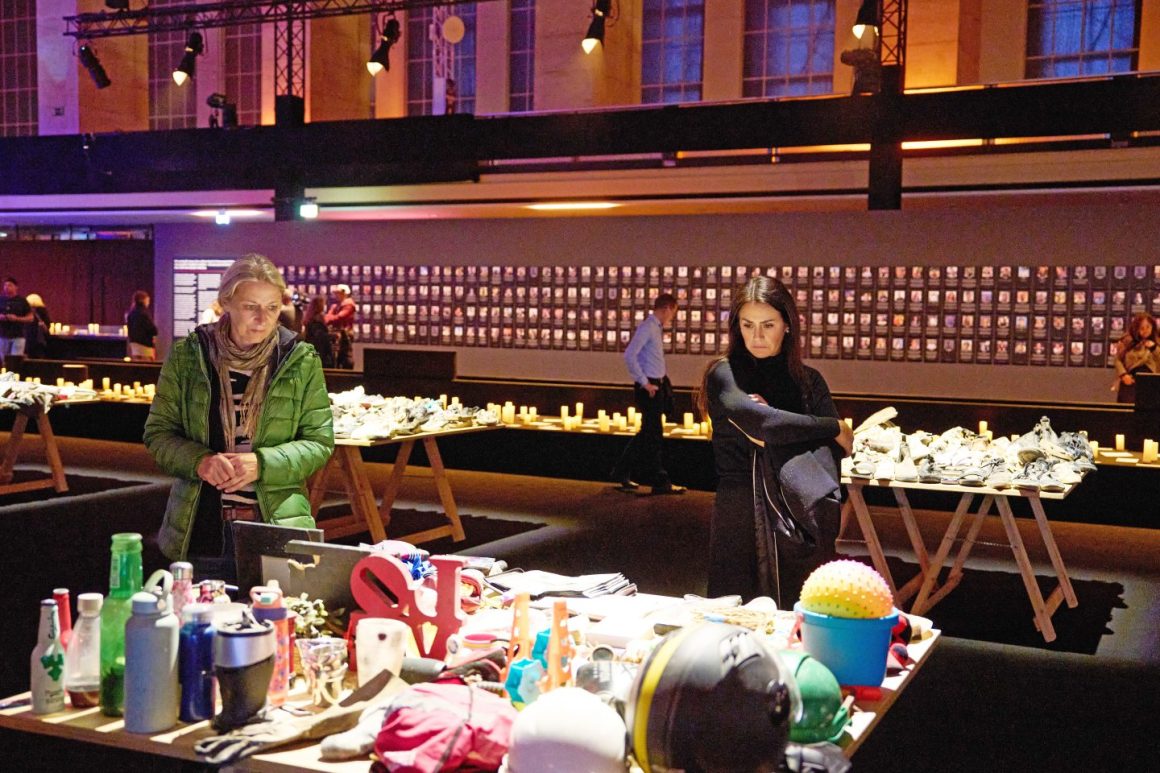 Das Besondere der Ausstellung sind die vielen Original-Gegenstände: die Bar mit dem zersplitterten Kassen-Display, die Zelte, in denen später die Leichen gefunden wurden, Plastik-Toiletten mit Einschusslöchern. In einem hinteren Raum sind Kleidungsstücke und andere private Gegenstände der Opfer ausgestellt. Vertraute Logos auf Basecaps, Shirts und Jeans. Daneben flackern Kerzen. An der Wand die Fotos der Opfer, die Gesichter fast alle jung und fröhlich. Besucher bleiben lange stehen, andere setzen sich auf Bänke, weinen leise oder legen die Hände an die Wände mit den Namen.