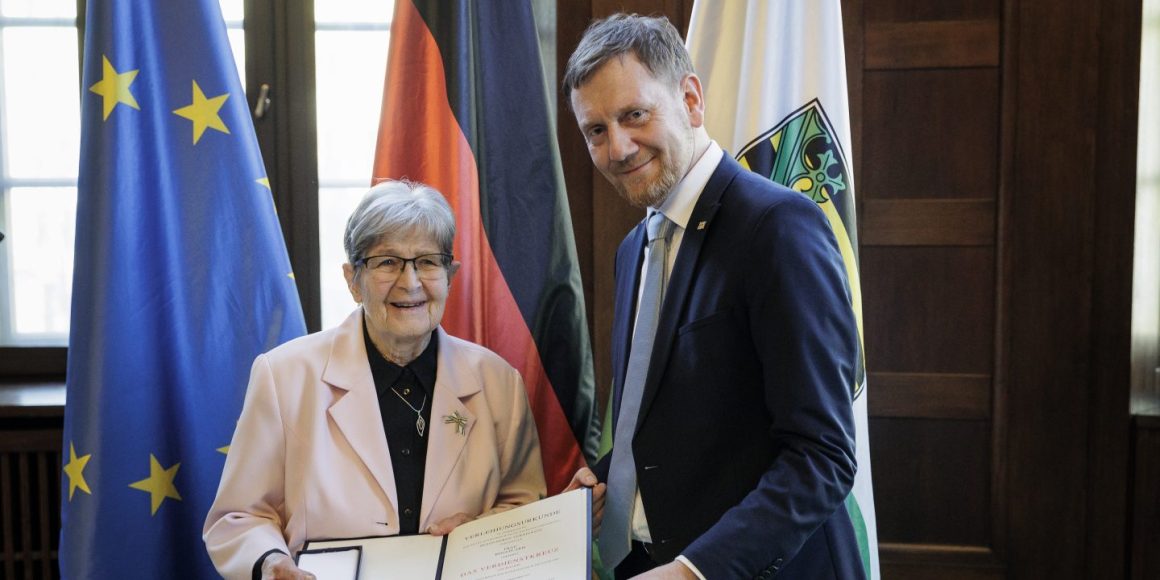 Es ist die höchste Anerkennung, die die Bundesrepublik für Verdienste um das Gemeinwohl verleiht. Sie ist gut sechs mal sechs Zentimeter groß, intensiv rot und hängt an einem schwarz-rot-goldenen breiten Band: das Bundesverdienstkreuz. Am 3. März hat diesen Orden die Dresdnerin Renate Aris erhalten, und auf dem Foto, auf dem die 90-Jährige mit dem sächsischen Ministerpräsidenten Michael Kretschmer zu sehen ist, strahlt sie. Aris ist eine von neun Bürgerinnen und Bürgern aus Sachsen, die das Verdienstkreuz bekommen haben.