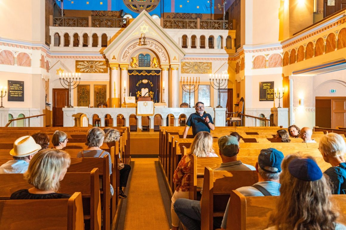 Joachim Jacobs, Mitglied der Jüdischen Gemeinde, beginnt seinen Vortrag mit einer Entschuldigung. Er sei Landschaftsarchitekt und habe noch nie eine Gruppe geführt. Doch er macht einen ziemlich routinierten Eindruck als Besucherbegleiter. Er sei im Vorstand der Synagoge und könne deshalb aus erster Hand berichten, wie die Freitagsgebete hier abgehalten werden. »Bei uns sitzen Frauen und Männer getrennt«, sagt er, »aber wir stimmen regelmäßig darüber ab, ob wir das ändern wollen.« Die meisten wollen das bisher nicht.