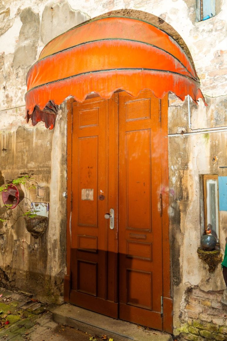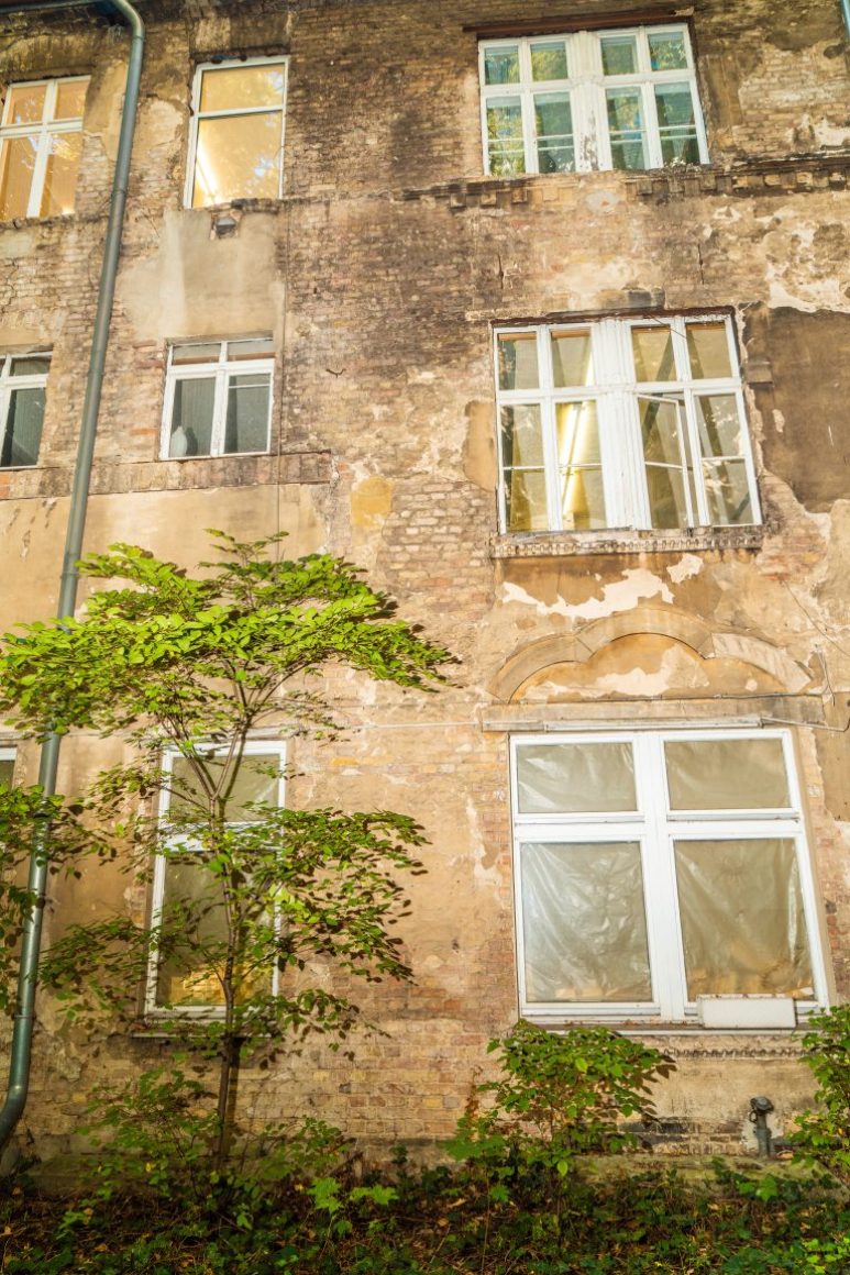 Die Kant-Garagen, noch heute ein Hingucker, ziehen letzte Blicke auf sich, da ist die Gruppe schon ein paar Meter weiter bei der Nummer 125 angelangt, wo das Problem mit der Klingel gelöst werden muss. Hier stand einst die eingangs erwähnte Thorat-Chesset-Synagoge, die heute kaum zu erkennen ist vor lauter Einschusslöchern. Im Internet ist zu lesen, dass sich hier ein Künstleratelier befinden soll, in der zweiten Etage brennt Neonlicht. Doch auf das Klingeln reagiert niemand.