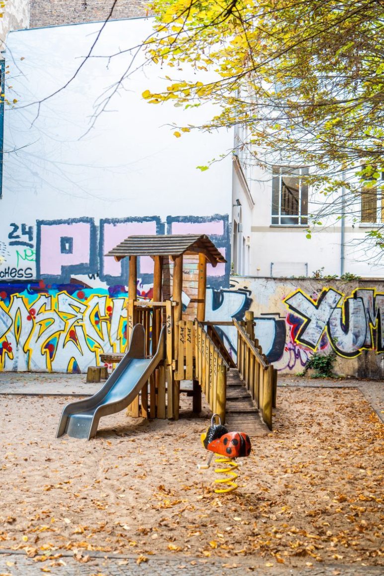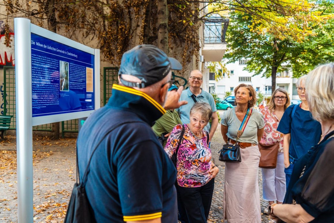 Der letzte Halt der Führung bringt die Gruppe zur Bleibtreustraße 2 – dem ehemaligen Standort der Mikwe der jüdischen Gemeinde in Charlottenburg. Dort, wo heute ein Kinderspielplatz ist, befand sich jahrzehntelang das rituelle Tauchbad, ein Ort spiritueller Reinigung und Teil des inneren Lebens einer Gemeinde.
